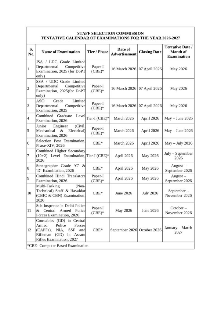 The Staff Selection Commission (SSC) has released the tentative exam calendar for 2026–27. This calendar is very useful for candidates preparing for government jobs through SSC exams like CGL, CHSL, MTS, GD Constable, JE, CPO, and Stenographer.